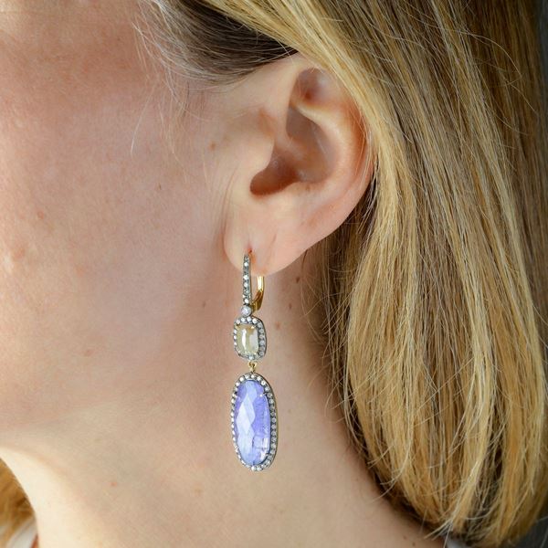 Pair of pendant earrings in 18 kt yellow gold, silver, tanzanite and diamonds
