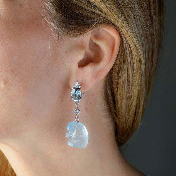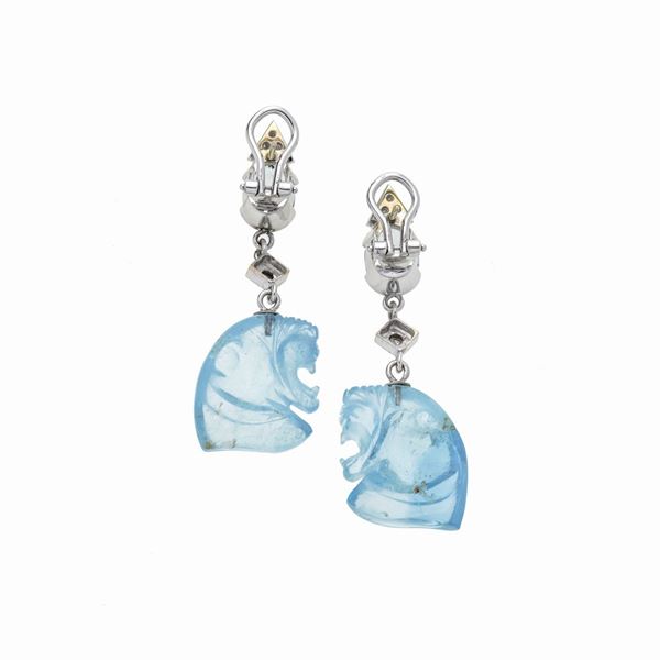 Length 5 cmPair of pendant earrings made with two oval-cut aquamarines for a total of 4.0 ct, brilliant-cut diamonds for 0.30 ct and two aquamarines carved like tiger heads for a total of 30 ct, 18.5 g