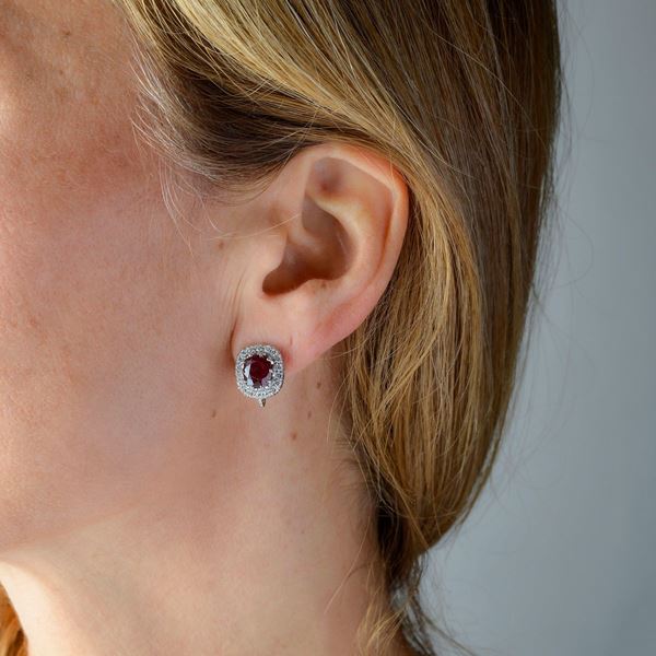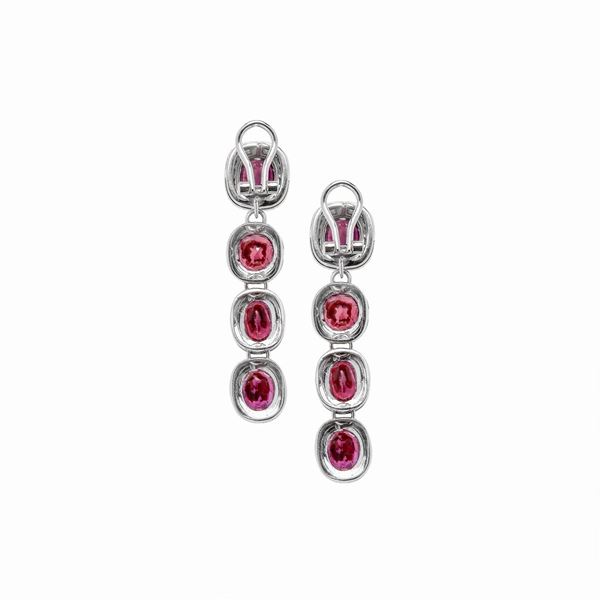 length 5 cmPair of earrings with eight oval cut rubies weighing 16.0 ct in total, the two largest weighing approximately 2.0 ct each and six smaller rubies each weighing approximately 1.65 ct, diamonds weighing approximately 0.35 ct, 17.6 g
