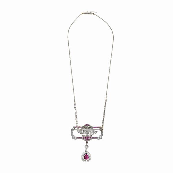 open chain 42.5 cm, brooch h 5 x 4.5 cmGeometric brooch with central platinum bow and white gold drop pendant decorated with old cut and huit-huit diamonds for 2.70 ct, color H/I, clarity VS-SI, and fancy cut rubies for 1.70 ct and drop cut of ct 1.50, the thin link chain embellished with huit-huit diamonds, bears the 750 mark, 20.6 g