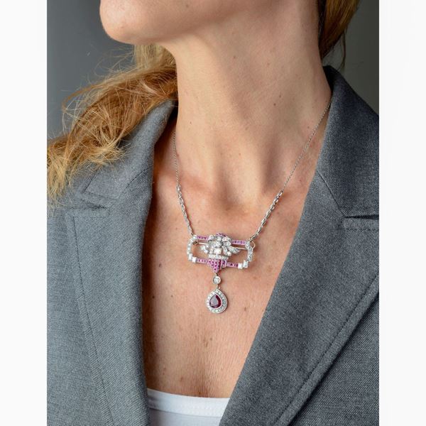 Pendant brooch in platinum, 18 kt white gold, rubies and diamonds with white gold and diamond chain