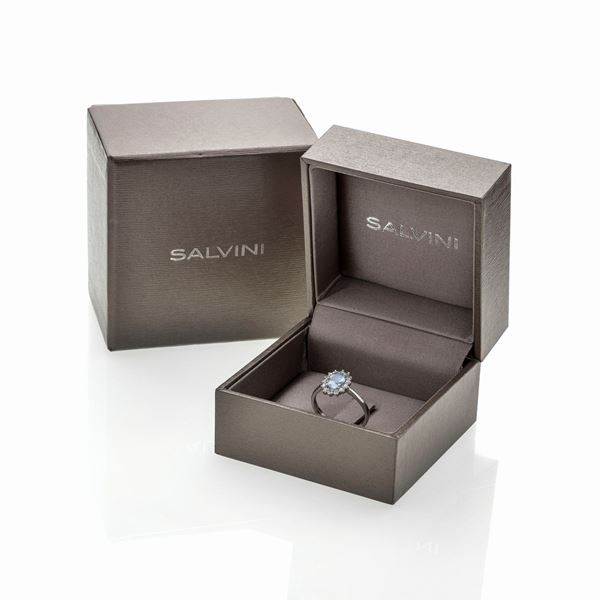 Size 8.5Ring centered by an oval cut aquamarine of approximately 1.15 ct mounted within a diamond frame of 0.28 ct, color H, SI, bears Salvini marks and 750 g 3.5, complete with original case