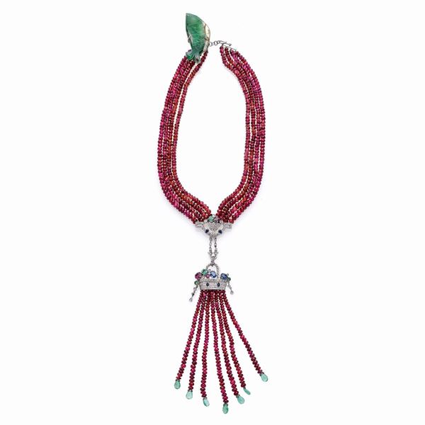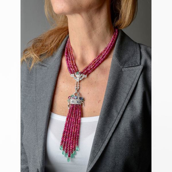 length 42 cm, central element length 18.5 cmMulti-strand necklace with long tassel in rubies and emeralds, central element in white gold, hui-huit cut diamonds for approximately 0.40 ct, rubies, emeralds and sapphires of various cuts, fish-shaped clasp in carved agate, 128.1 g