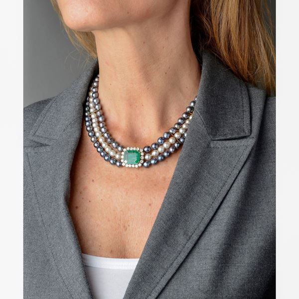 length 41.7 cm, central element 2.3 x 2 cmThree strand necklace of gray and white pearls diam. 7 mm, central element with emerald of approximately 6.40 ct and brilliant-cut diamonds of approximately 2.70 ct J-K, 85.7 g