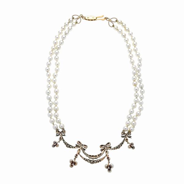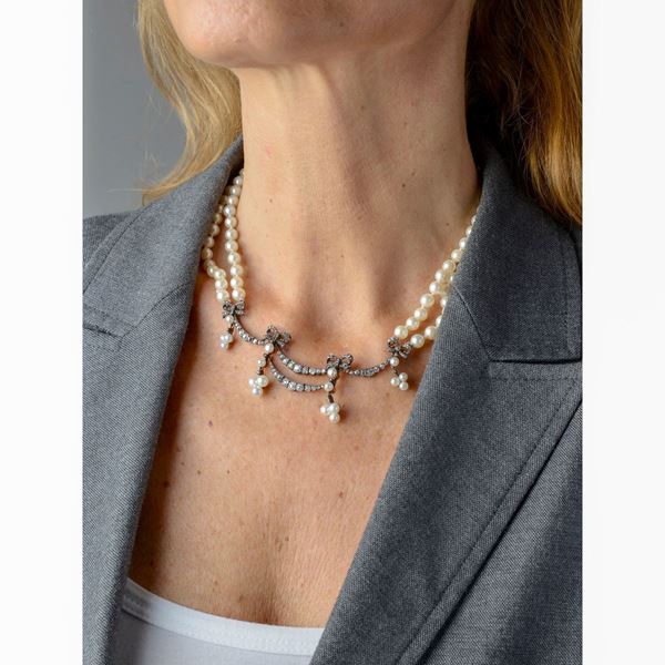 Two-strand pearl necklace with central festoon in low-grade gold, silver, diamonds and pearls