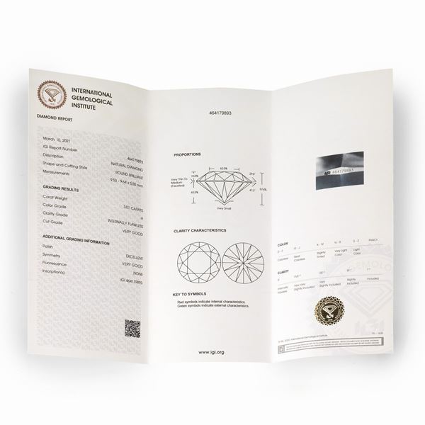 Diamond of ct 3.01, color H, IF, accompanied by IGI certificate, num. 464179893 dated 10.03.2021
