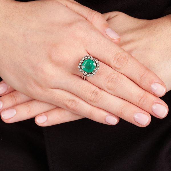 Size 16Daisy ring with huit huit cut diamonds for 0.35 ct, color H-I, SI and square cut emerald of 4.10 ct, emerald with slight lateral chipping, 7.0 g