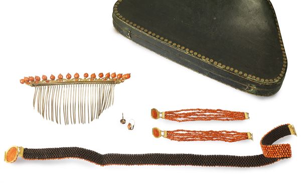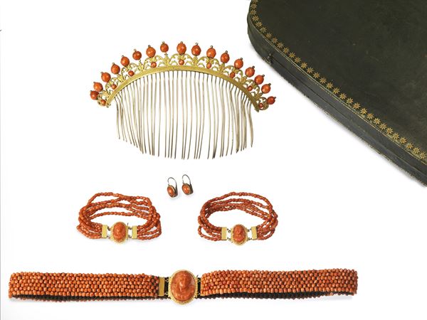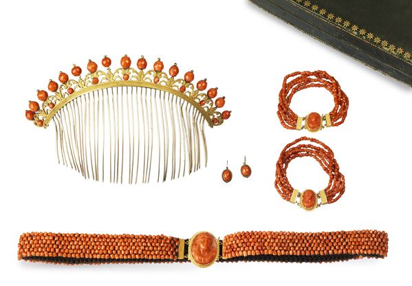 Comb 17 x 10 cm, belt open length 57.5 cm, open bracelets 15.5 cm, earrings 1 x 2 cmImportant set in yellow gold and Sciacca coral composed of a large gold hairdressing comb surmounted by a tiara with pierced and chiselled gold scrolls, embellished with small faceted coral spheres; woven ribbon belt decorated with faceted corals, the firmness made with an oval coral cameo carved with Diana's face mounted within a gold bezel chiseled with leaf motifs; the bracelet made of four strands of firmly faceted coral in oval coral carved with a female face with a classic hairstyle within a gold bezel chiseled with leaf motifs; the gold lever earrings with oval cabochon coral are missing the pendant cameo. The comb bears a difficult-to-read stamp, probably Papal State, 178.8 g