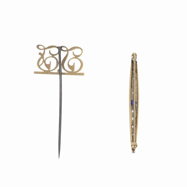 Bar length 5 cm, 2.3x1.5 cmSapphire and diamond rose bar brooch in yellow and white gold; pin with initials, the needle is metal, g 6.9