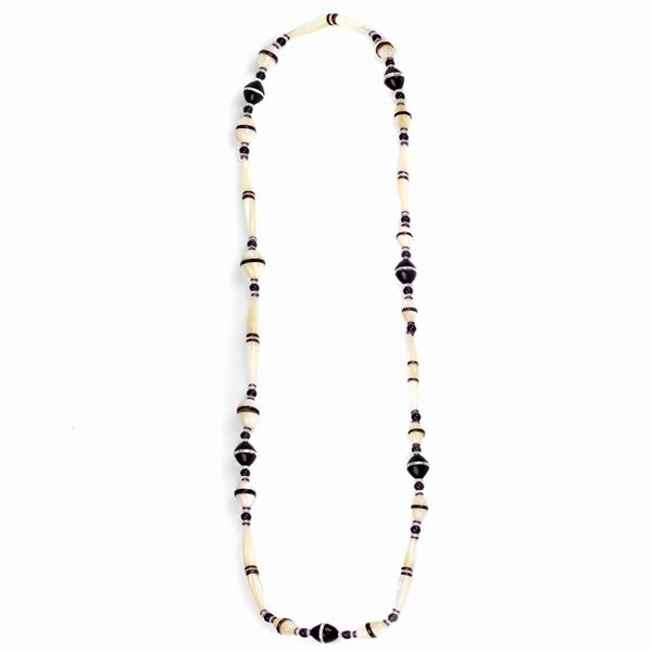 lengths respectively 51 cm closed, 46.5 cm open, 34 cm closedThree necklaces respectively: in mother-of-pearl and colorless glass elements and in imitation of amethyst; in mother of pearl, black stones and golden metal; in 9 kt gold, polychrome enamel and green glass spheres imitating peridot, 239.1 g