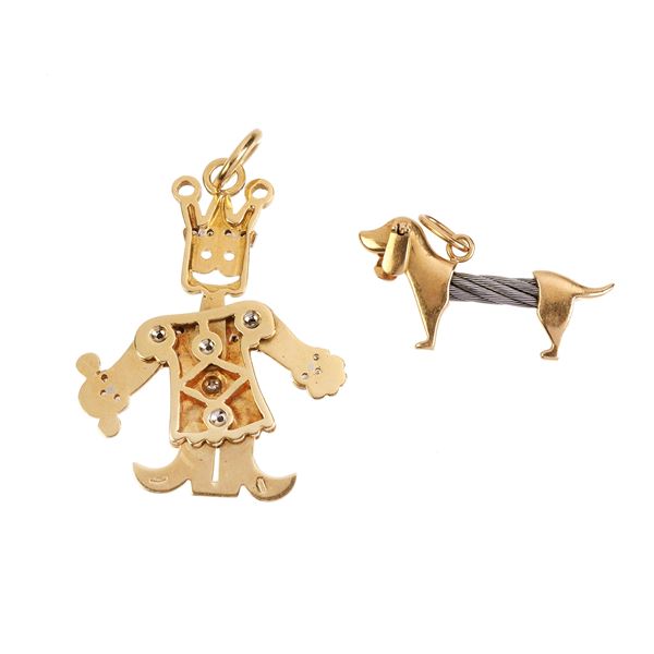 Large King pendant in 18 kt yellow gold, white gold and diamonds and Dachshund pendant in gold and metal