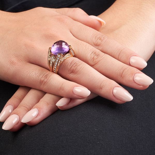 Large ring in 18 kt yellow gold, diamonds and amethyst