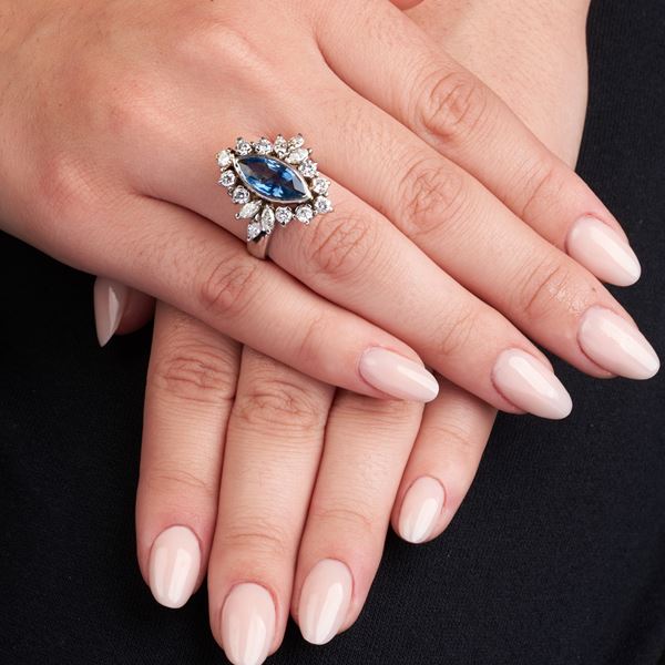 Size 15Brilliant and marquise cut diamonds weighing 1.60 ct, color I-J, SI and natural marquise cut sapphire weighing 2.50 ct, 11.1 g