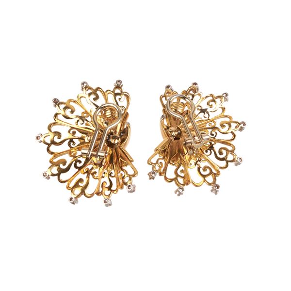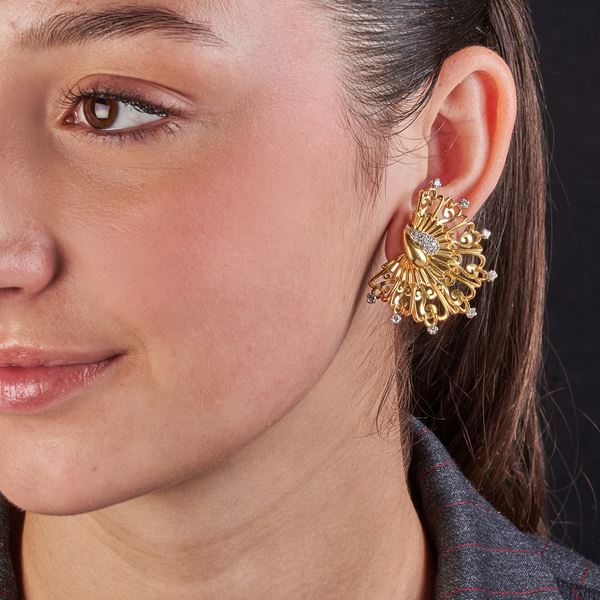 Pair of large fan earrings in 18 kt yellow gold and diamonds