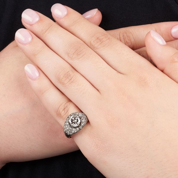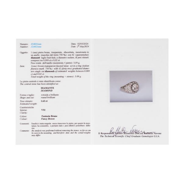 Size 11Brilliant cut diamond of 1.63 ct, fancy Brown, VS1 and pavé of huit huit cut diamonds for 0.90 ct, 5.09 g, accompanied by R.A.G. certificate. number J24021mn dated 02.05.2024