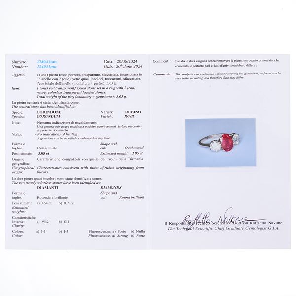 Size 10two brilliant cut diamonds of 0.64 ct, color I-J, VS2 and 0.70 ct, color I-J, SI1 respectively and an oval cut ruby of 3.05 ct, natural Burmese, the ring is accompanied by an R.A.G. certificate. number j24041mn, dated 06.20.2024, gr 5.7