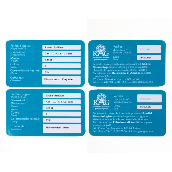 brilliant cut diamond of 1.44 ct, color I, VS2, accompanied by R.A.G. certificate number DV24082 DATED 06.25.2024 and another brilliant cut diamond of 1.54 ct, color I, VS2, accompanied by R.A.G. certificate. number DV24083 dated 06.25.2024, gr 3.4