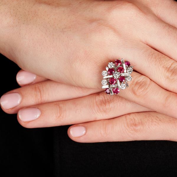 Fantasy ring in 18 kt white gold, diamonds and rubies