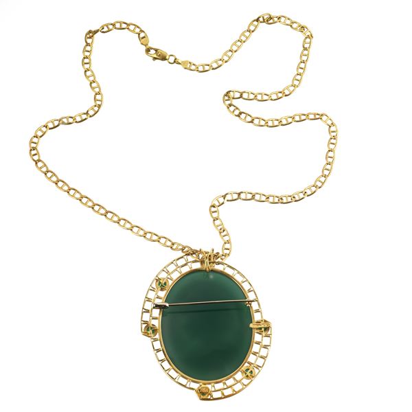 Large pendant-brooch with cameo in plastic material, yellow gold and long 18k yellow gold chain