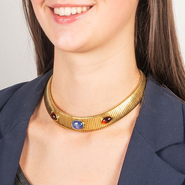 Tubogas choker in 18kt yellow gold, garnets and light sapphire