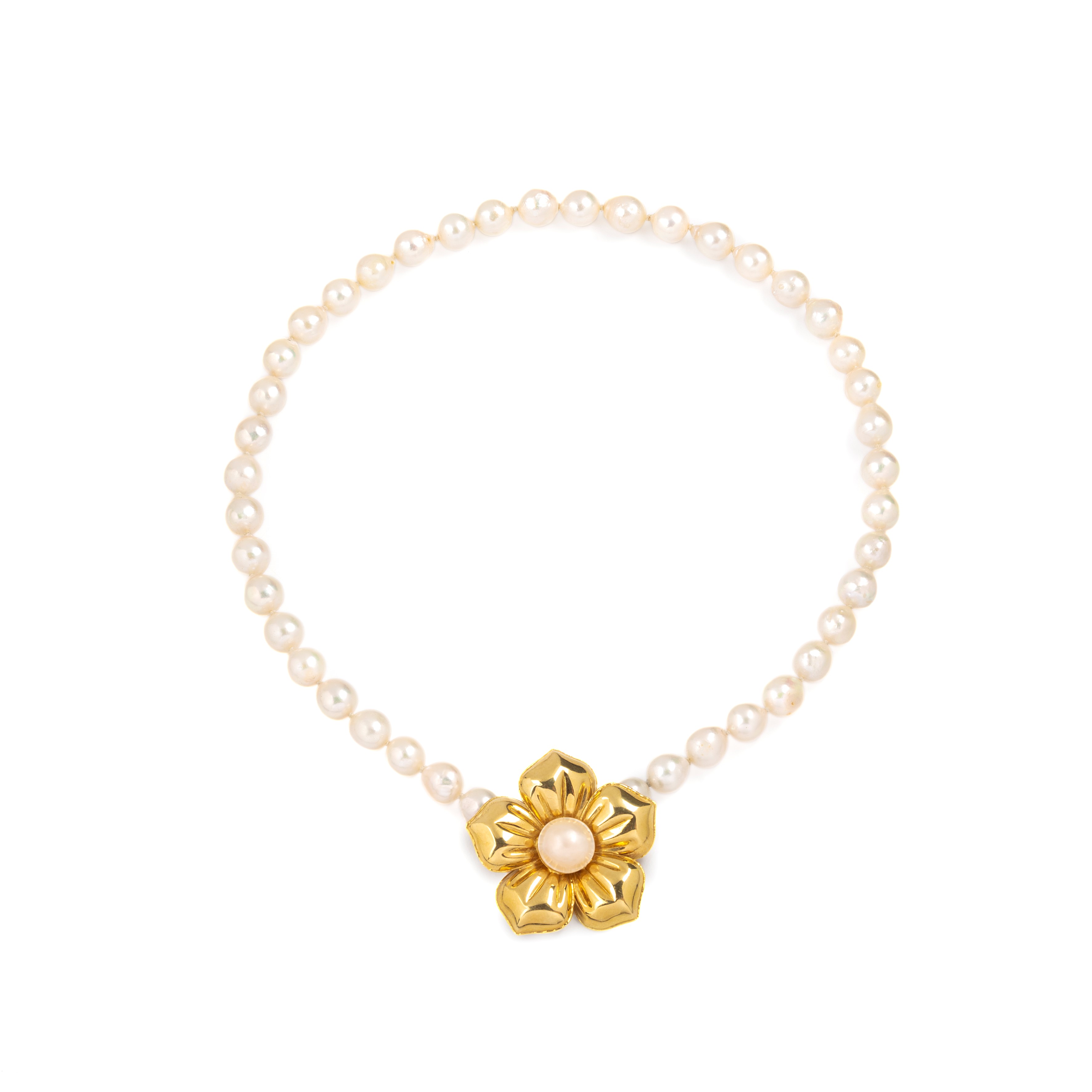 Cultured pearl strand, with 18kt yellow gold floral clasp and mabé pearl