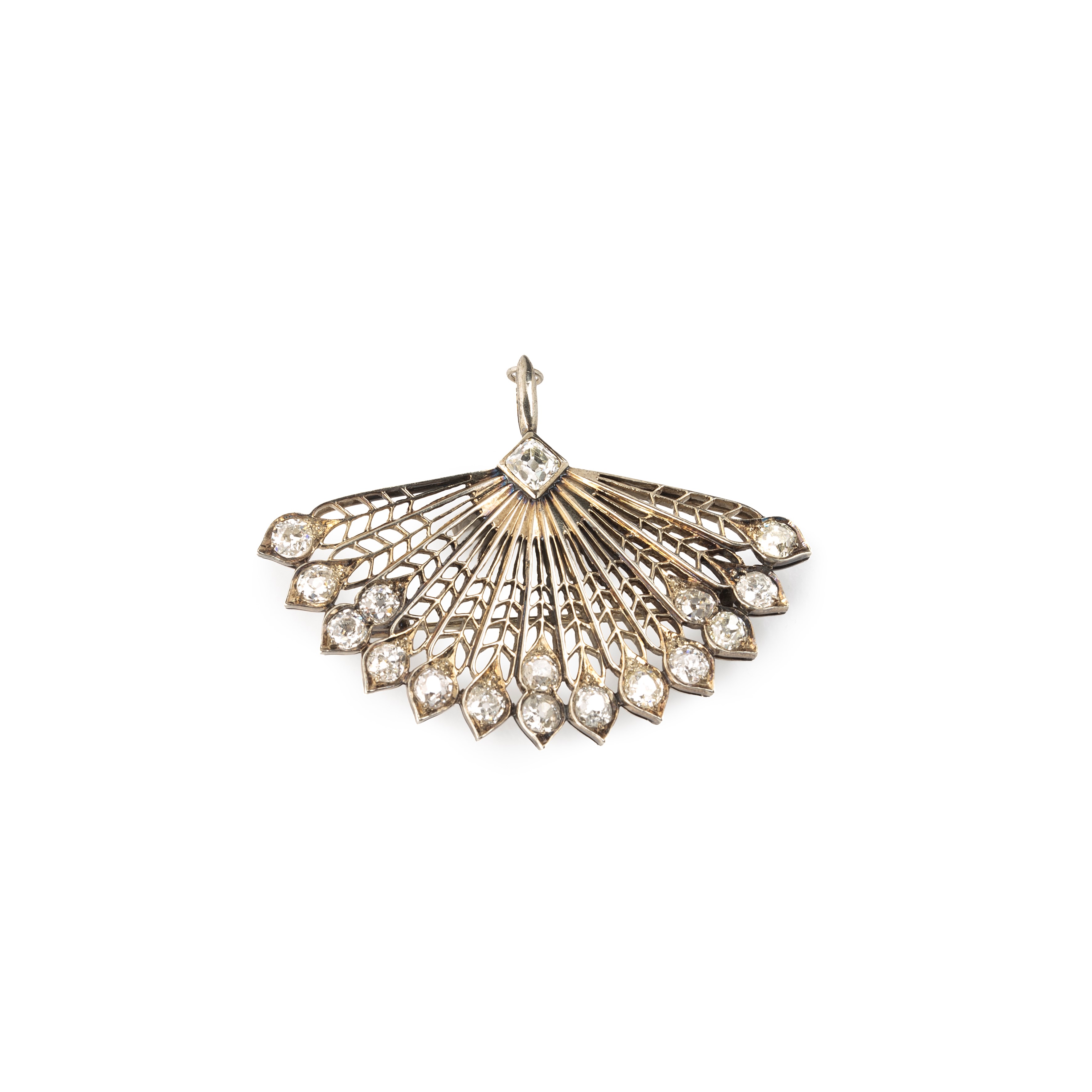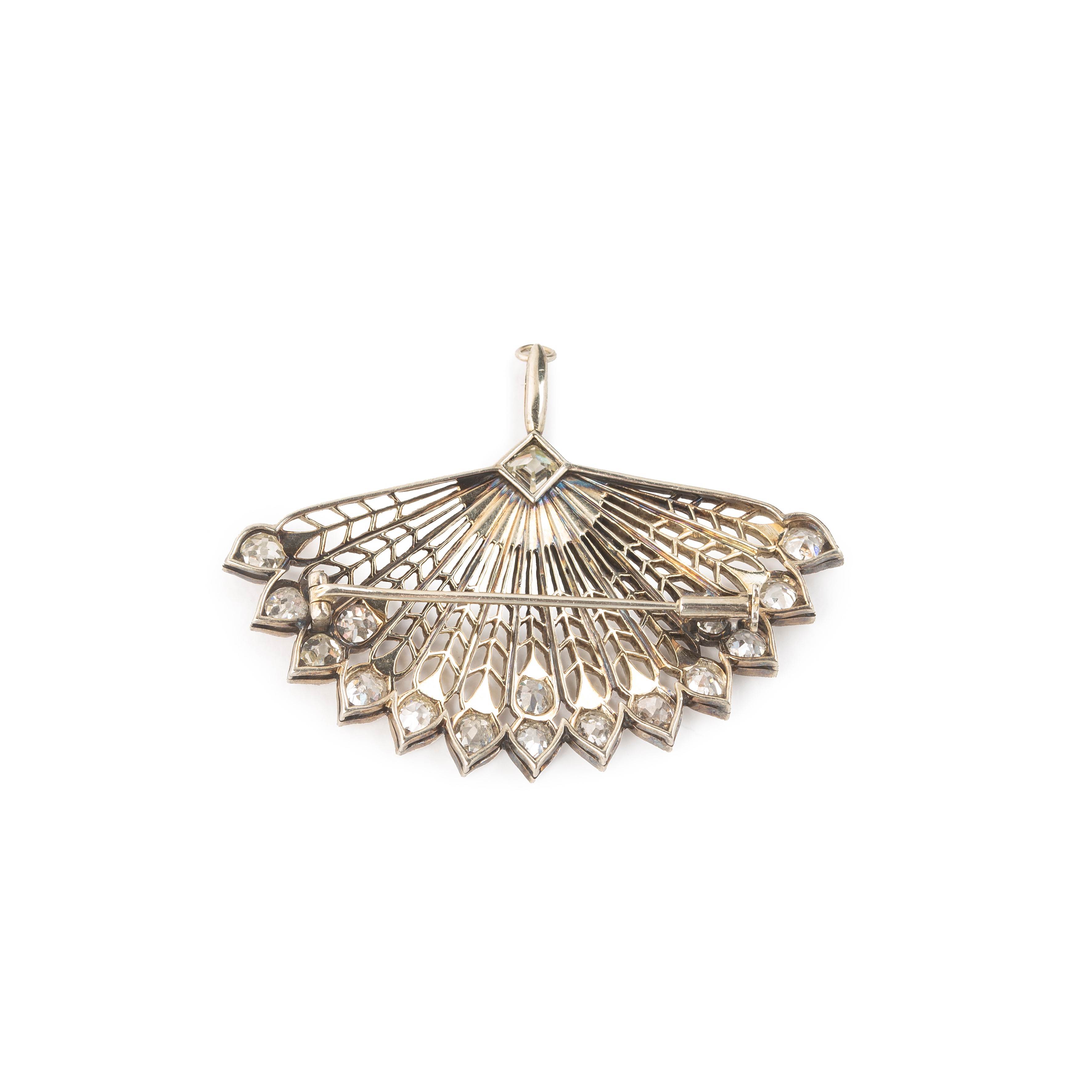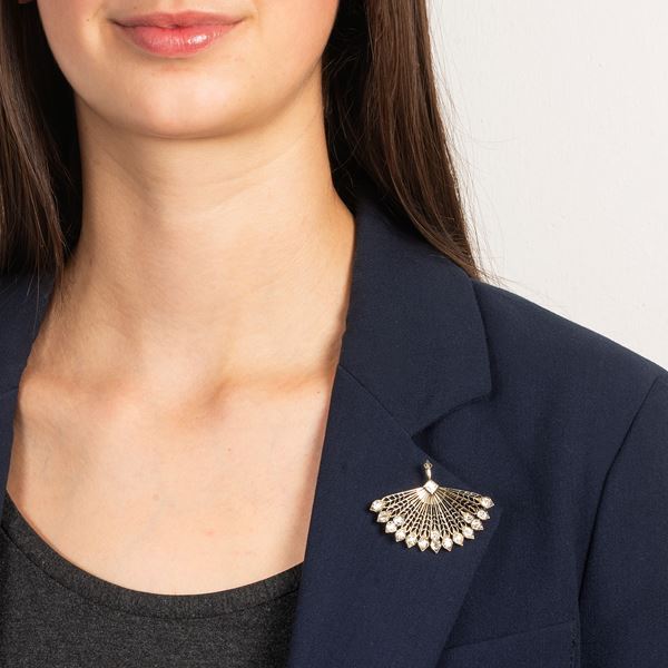 Fan brooch in 18 kt white and yellow gold and diamonds
