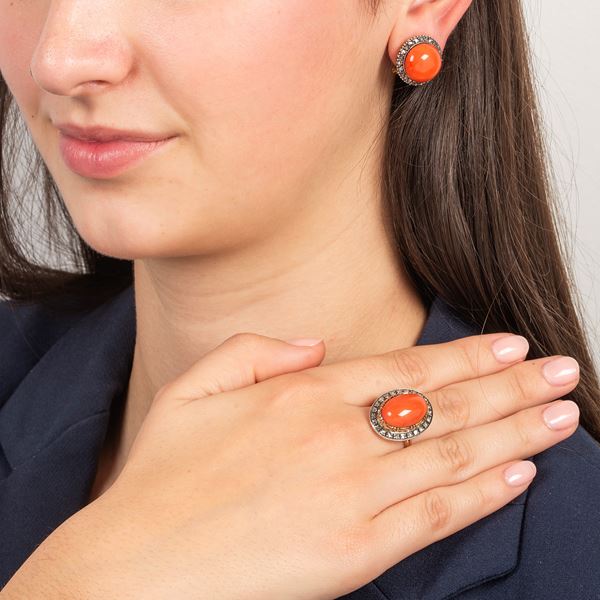 Pair of earrings and ring in 18kt yellow gold, silver, diamonds and red coral