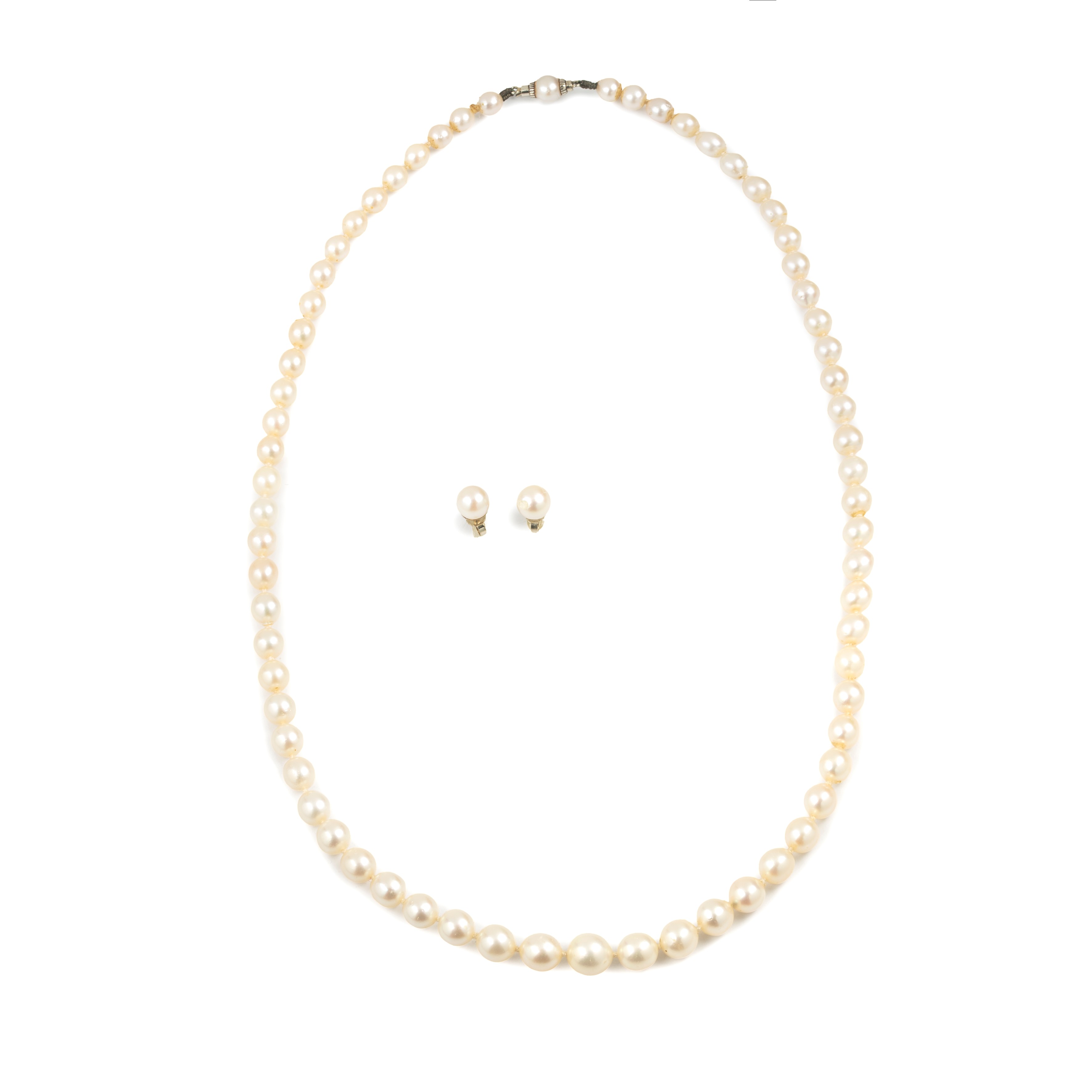 Strand of cultured pearls and 18kt white gold and pair of earrings with pearls en suite