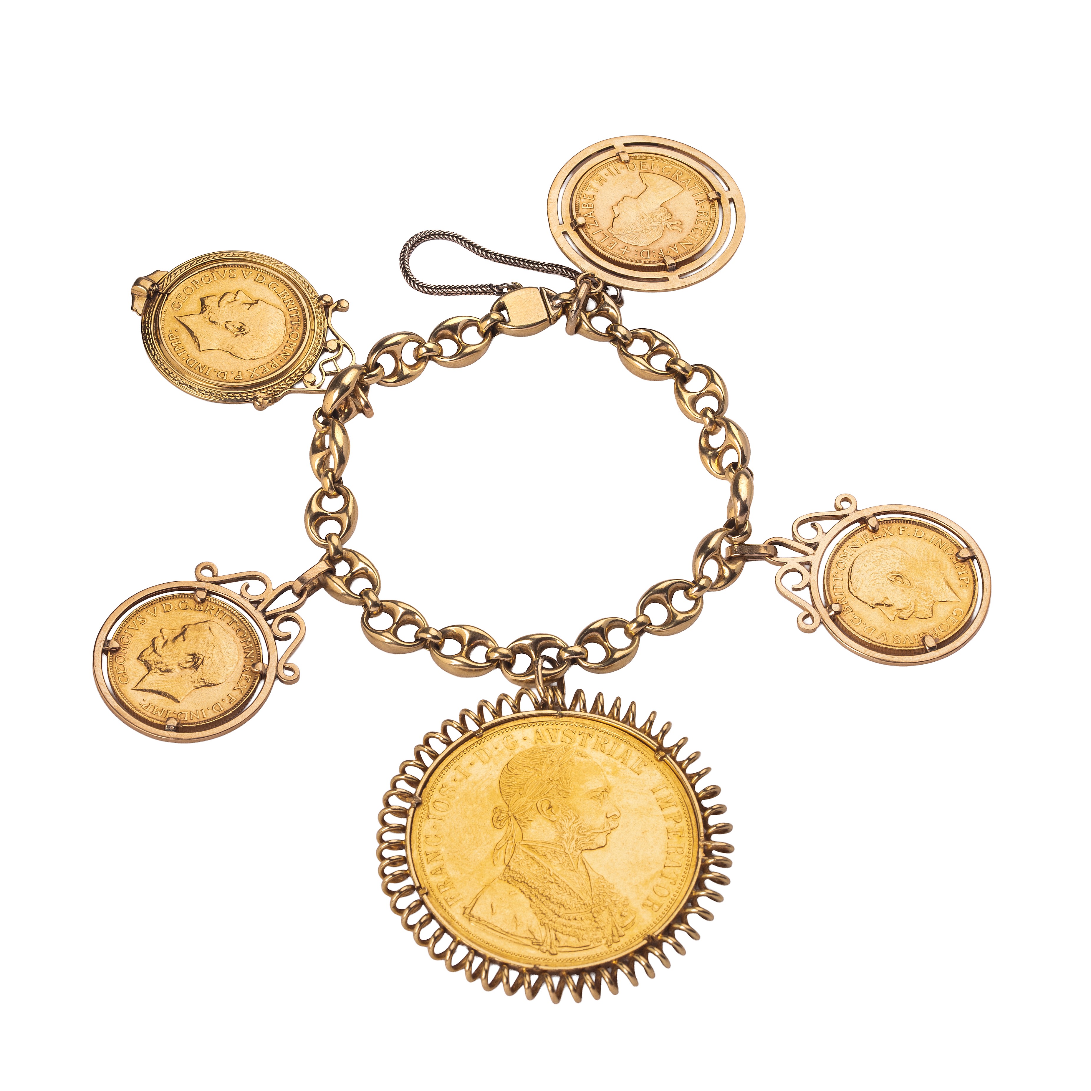 18 kt yellow gold marine link bracelet with four pounds and 4 ducats from 1915 "Francesco Giuseppe"