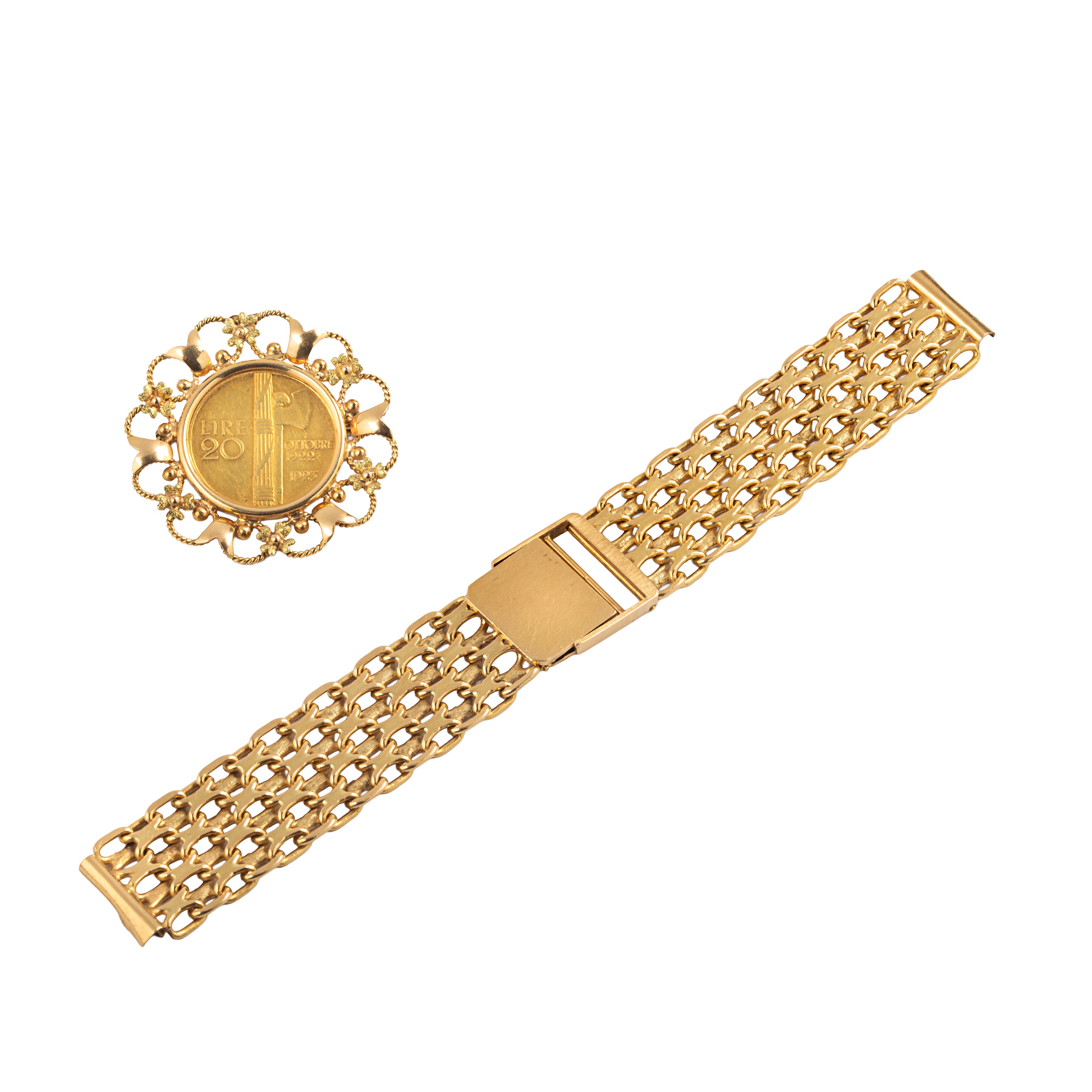 Brooch with 20 lire coin in yellow gold and 18 kt gold watch bracelet