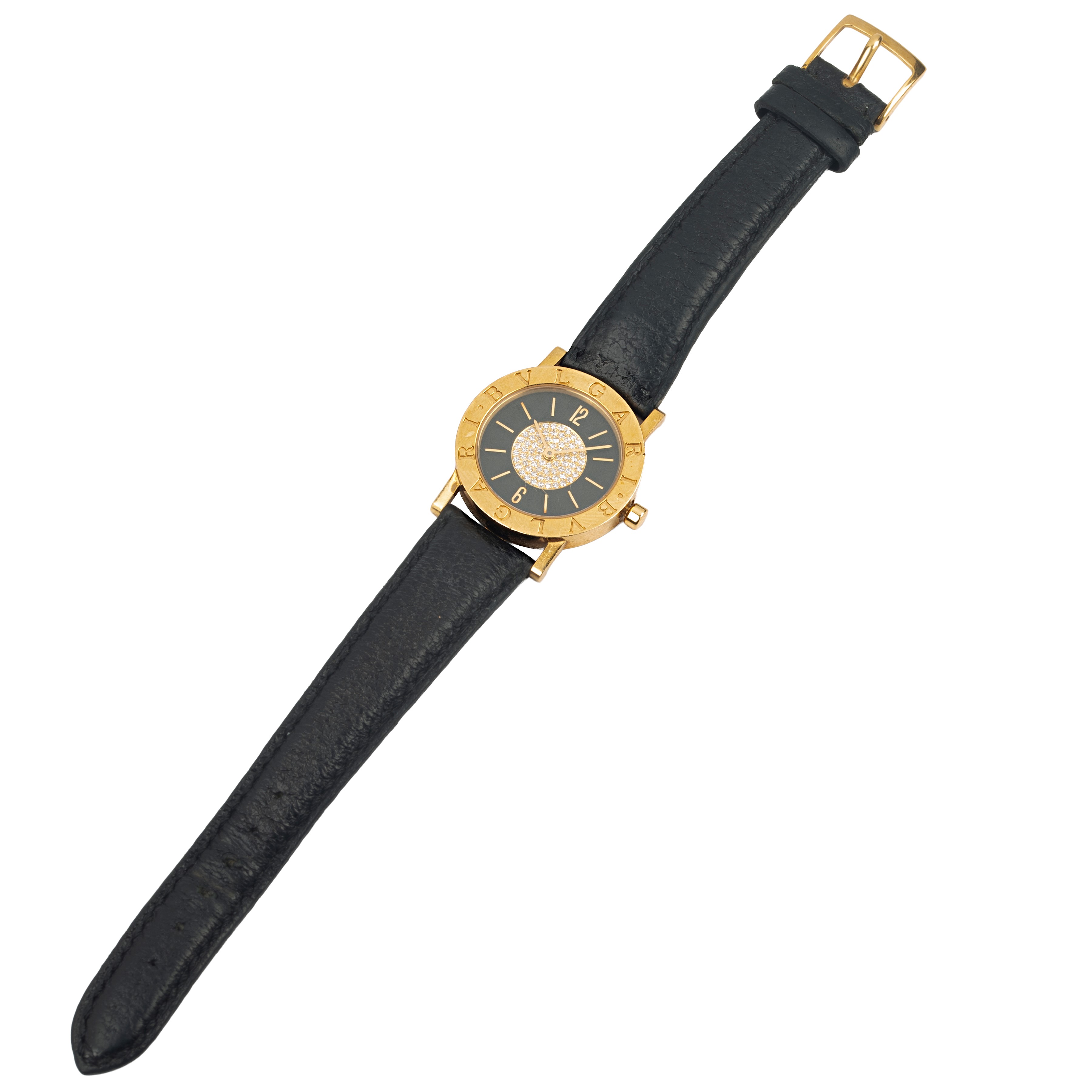 diameter 33 mmPavé diamond dial, quartz movement, black leather strap with original yellow gold buckle