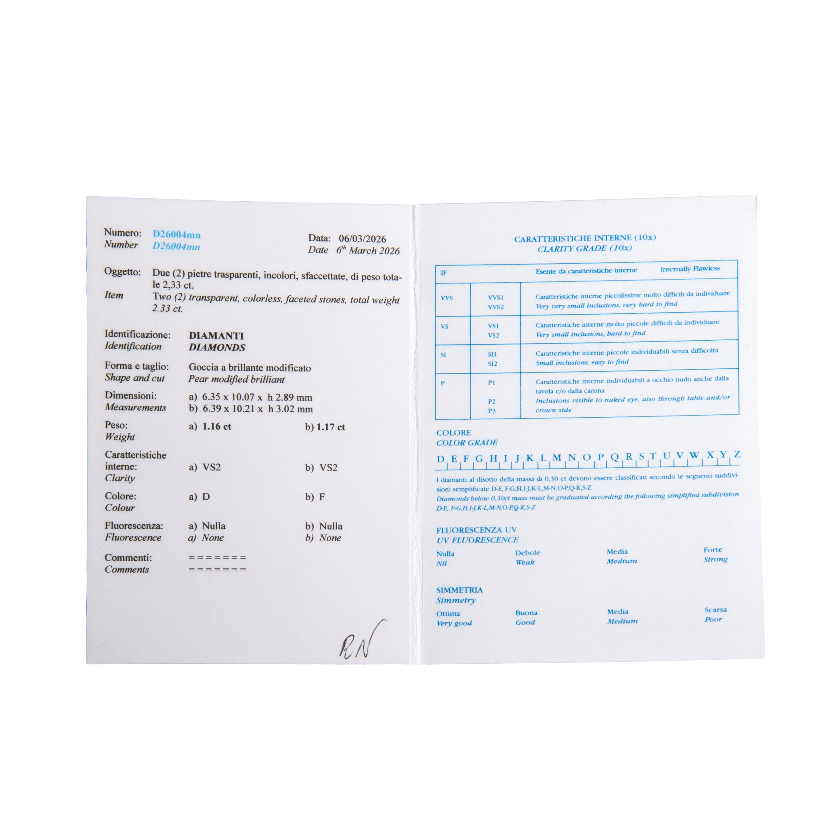 Size 12Two pear-cut diamonds, each of 1.16 ct, color D, VS2 and 1.17 ct, color F, VS2 and baguette-cut diamonds for 0.70 ct, color G, VS, the drops are accompanied by R.A.G certificate, number D26004mn dated 06.03.2026, gr 6.3