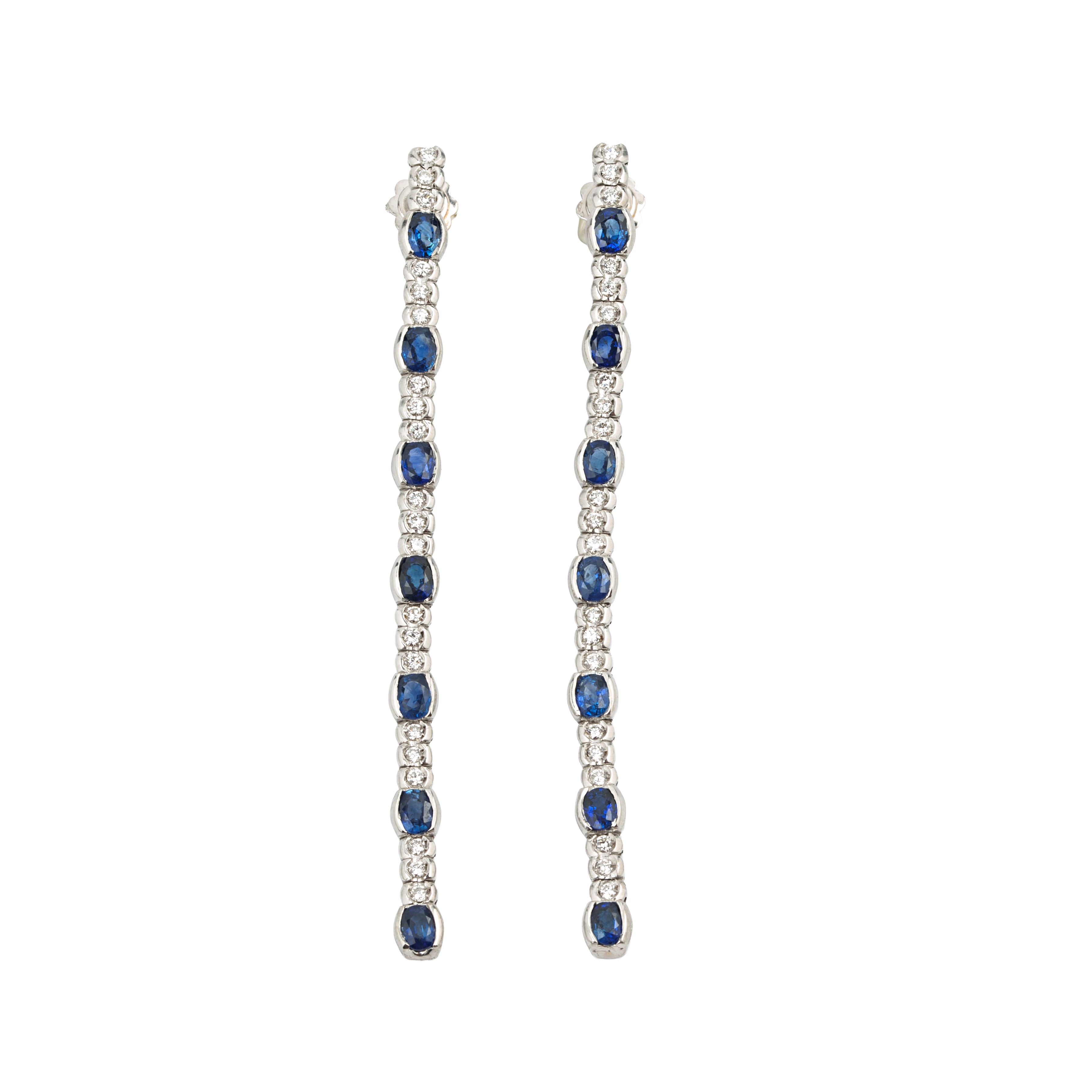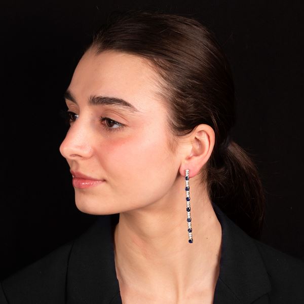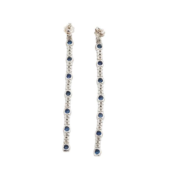 Pair of long pendant earrings in 18 kt white gold, diamonds and sapphires