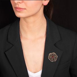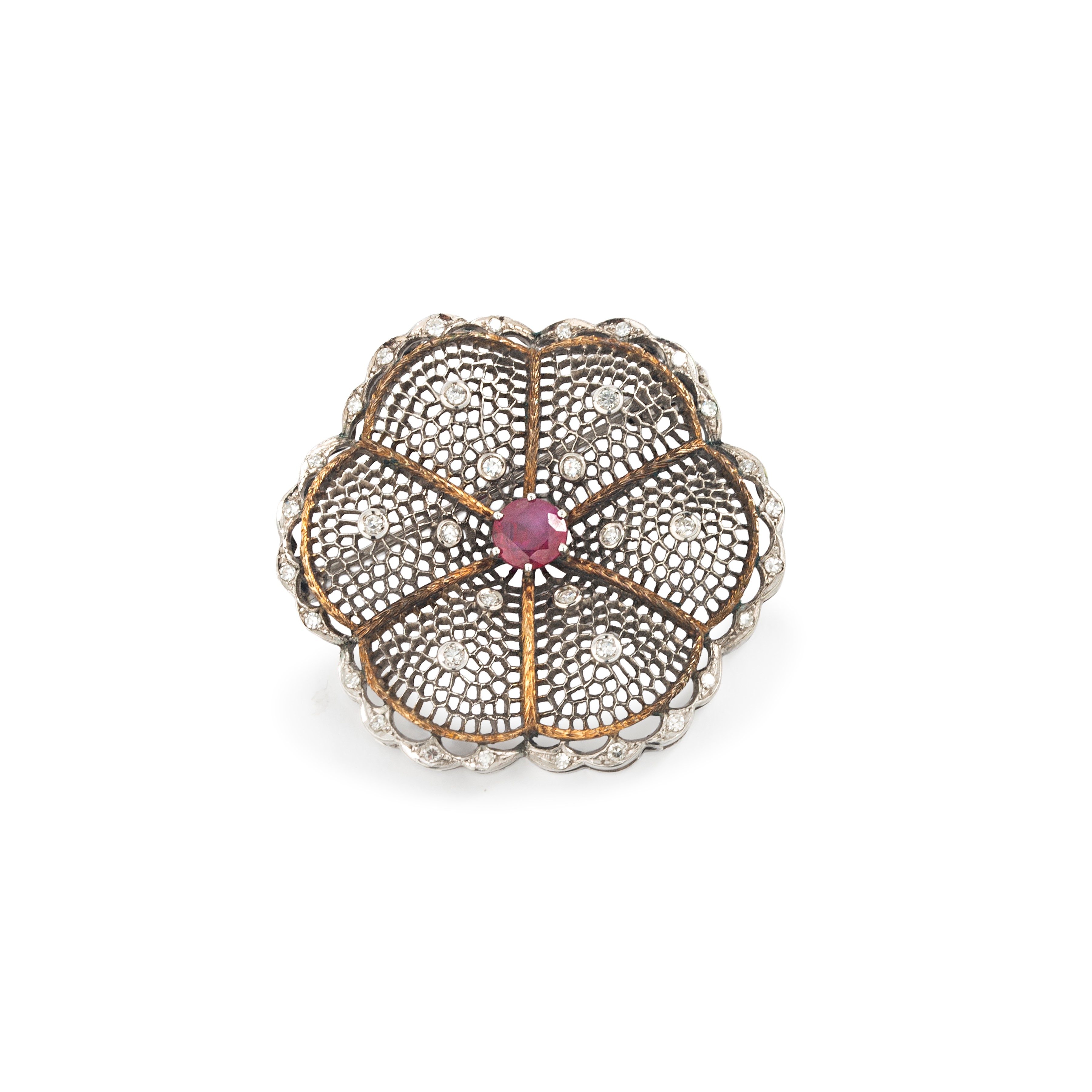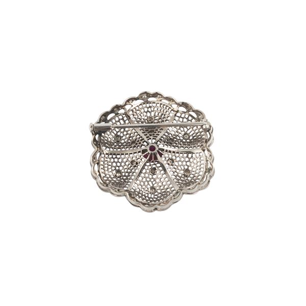 Floral brooch in 18 kt white and yellow gold, diamonds and rubies