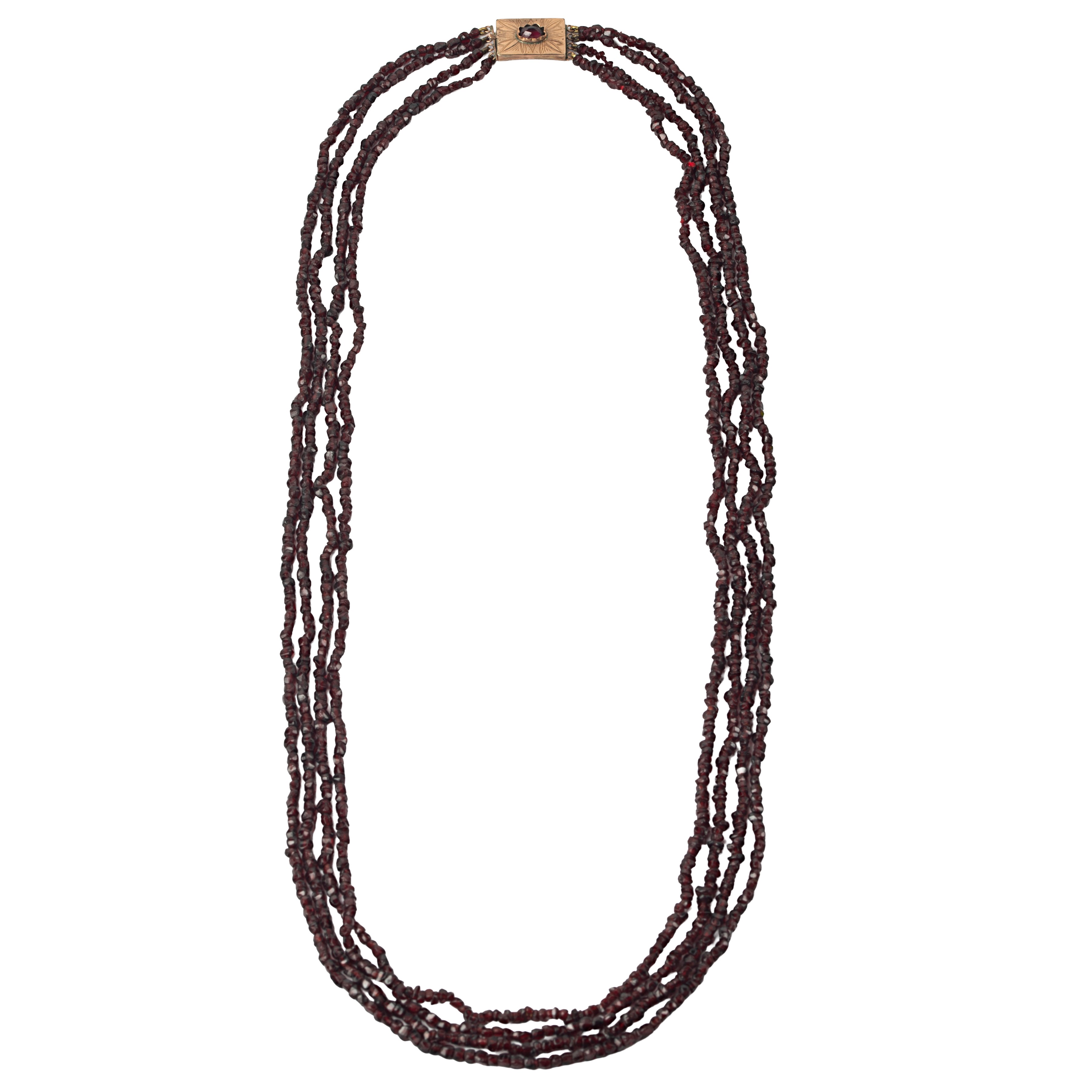 Four strand garnet necklace with low title gold and garnet fastening
