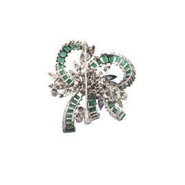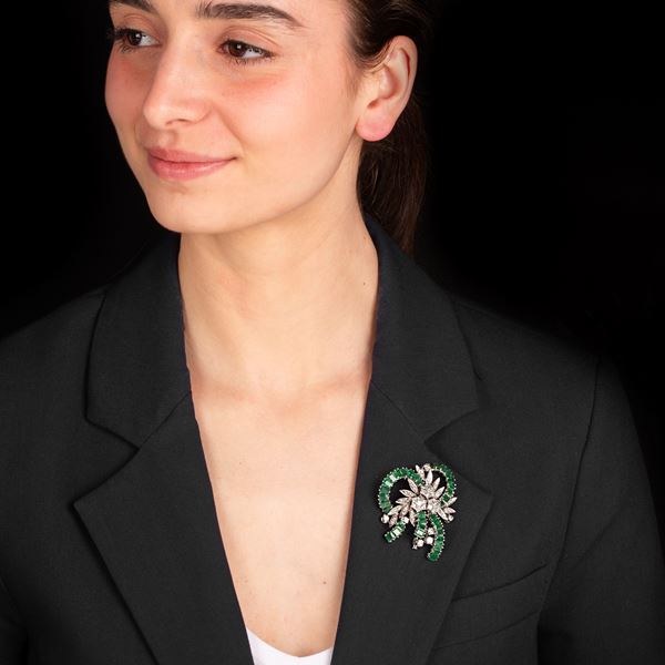 Large bow brooch in 18 kt white gold, diamonds and emeralds