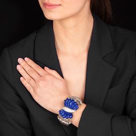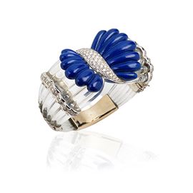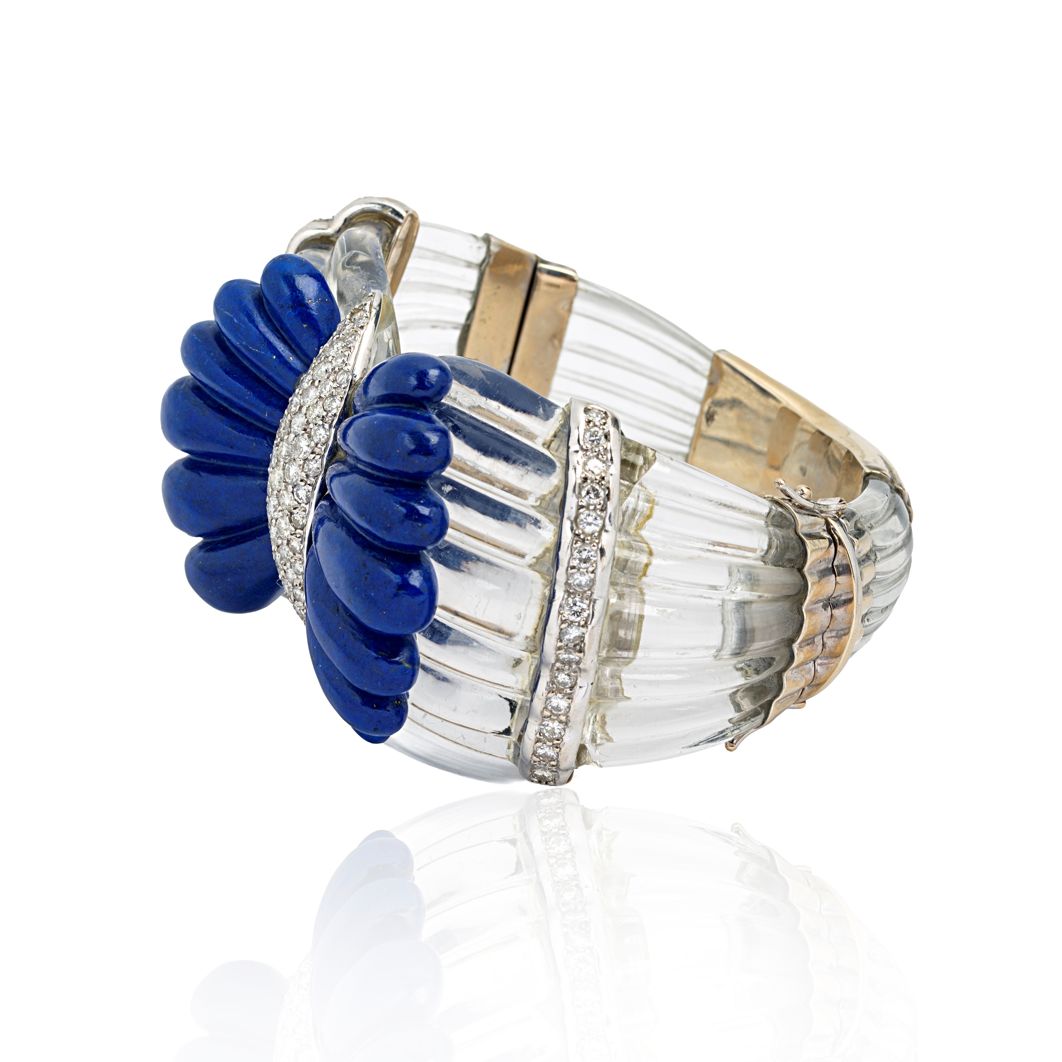 Large rigid bracelet in 18 kt white gold, rock crystal, diamonds and lapislazuli