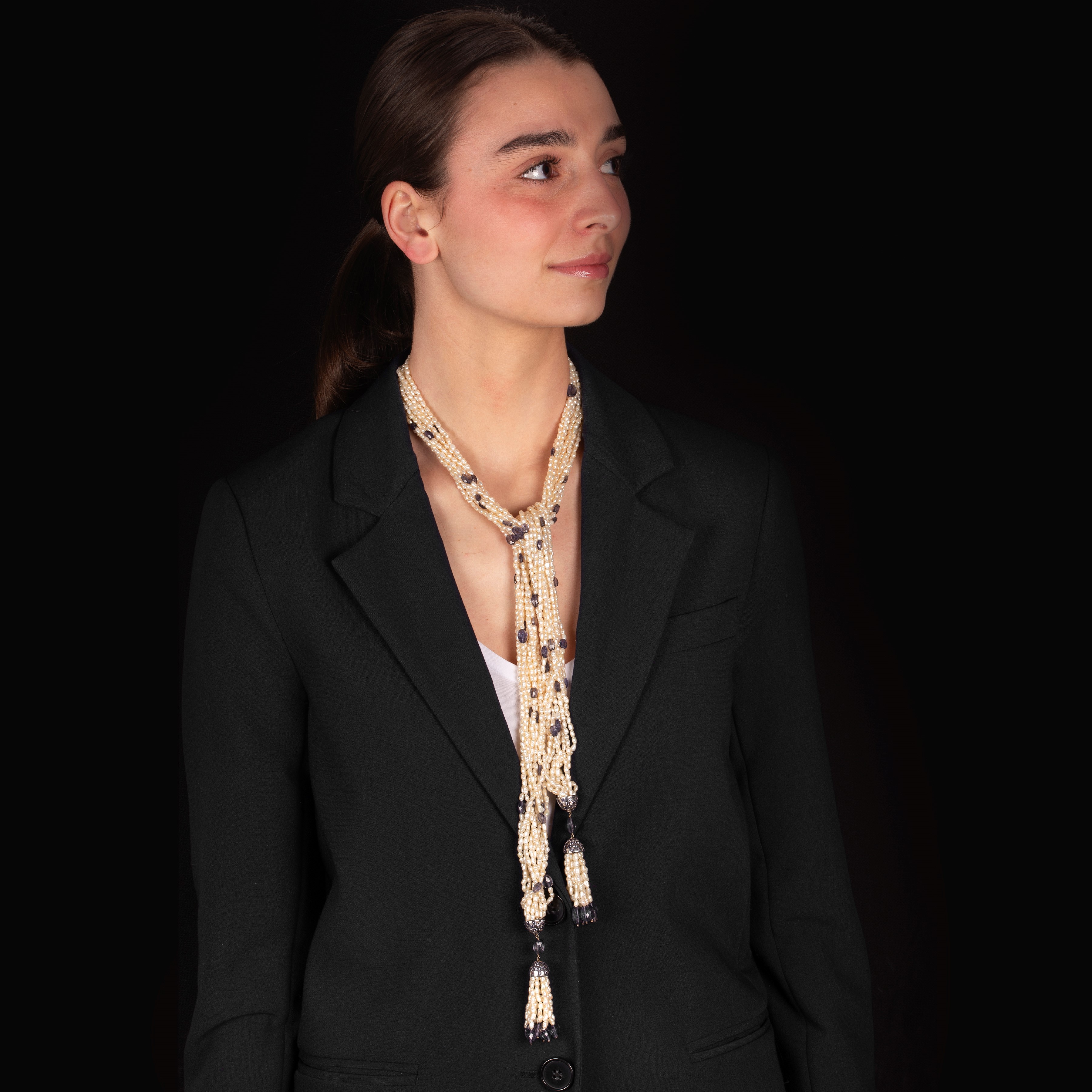 Long millefili necklace in river pearls, 18 kr white gold and iolite
