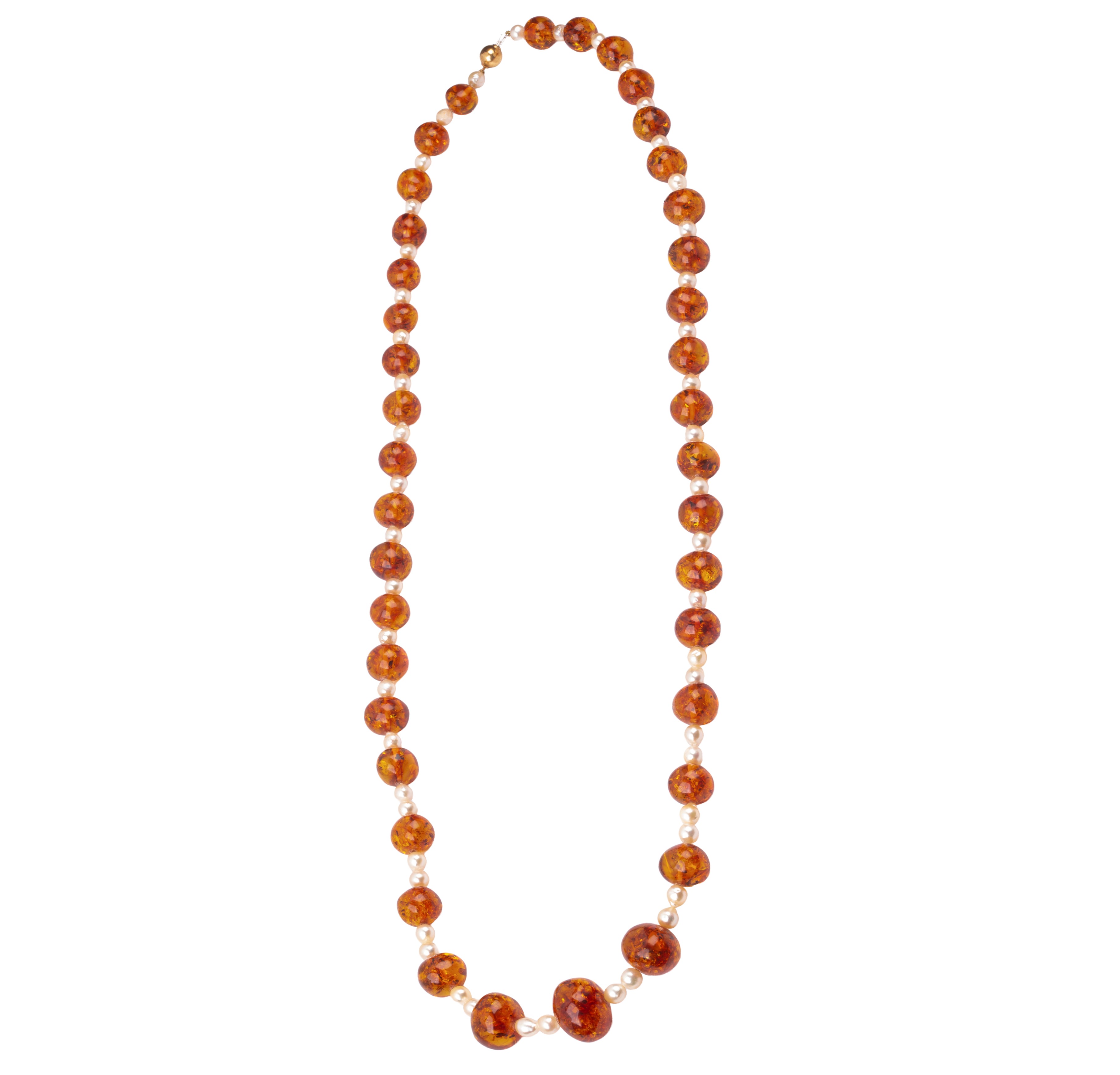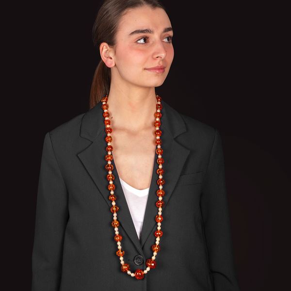 Long necklace in 18 kt yellow gold, amber and cultured pearls