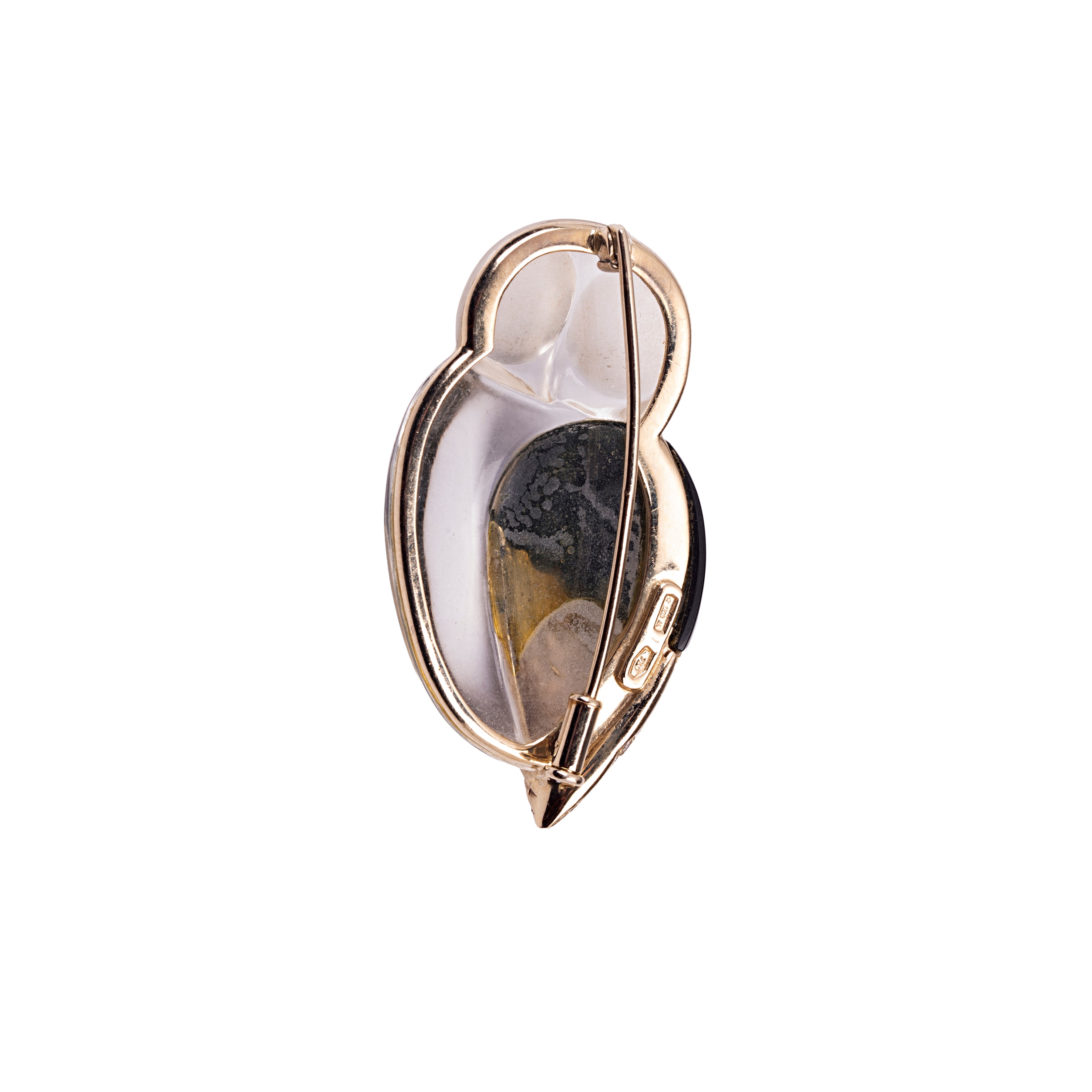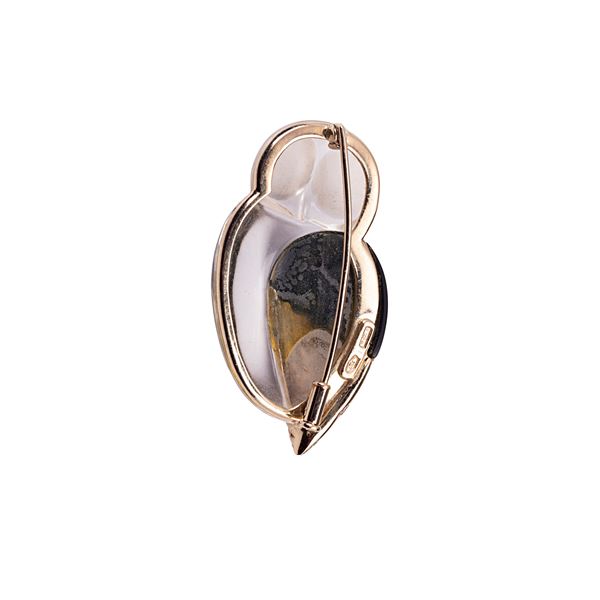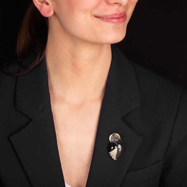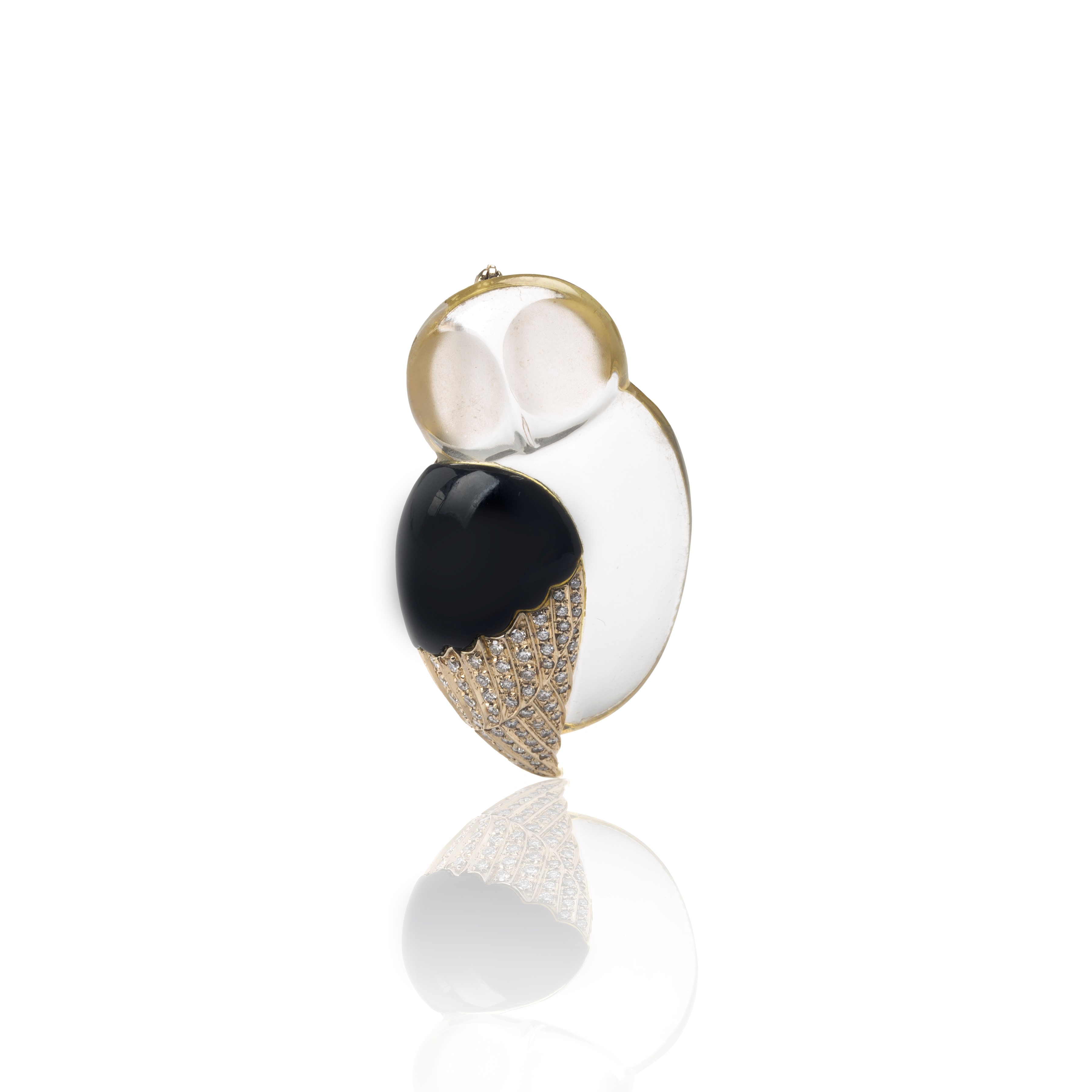 Owl brooch in 18kt white gold, crystal, black enamel and diamonds