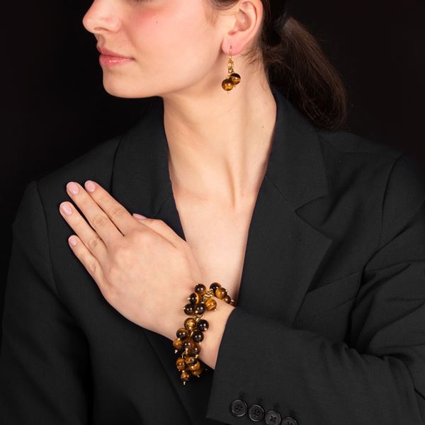 Pair of drop earrings and large bracelet in 18kt yellow gold and tiger's eye