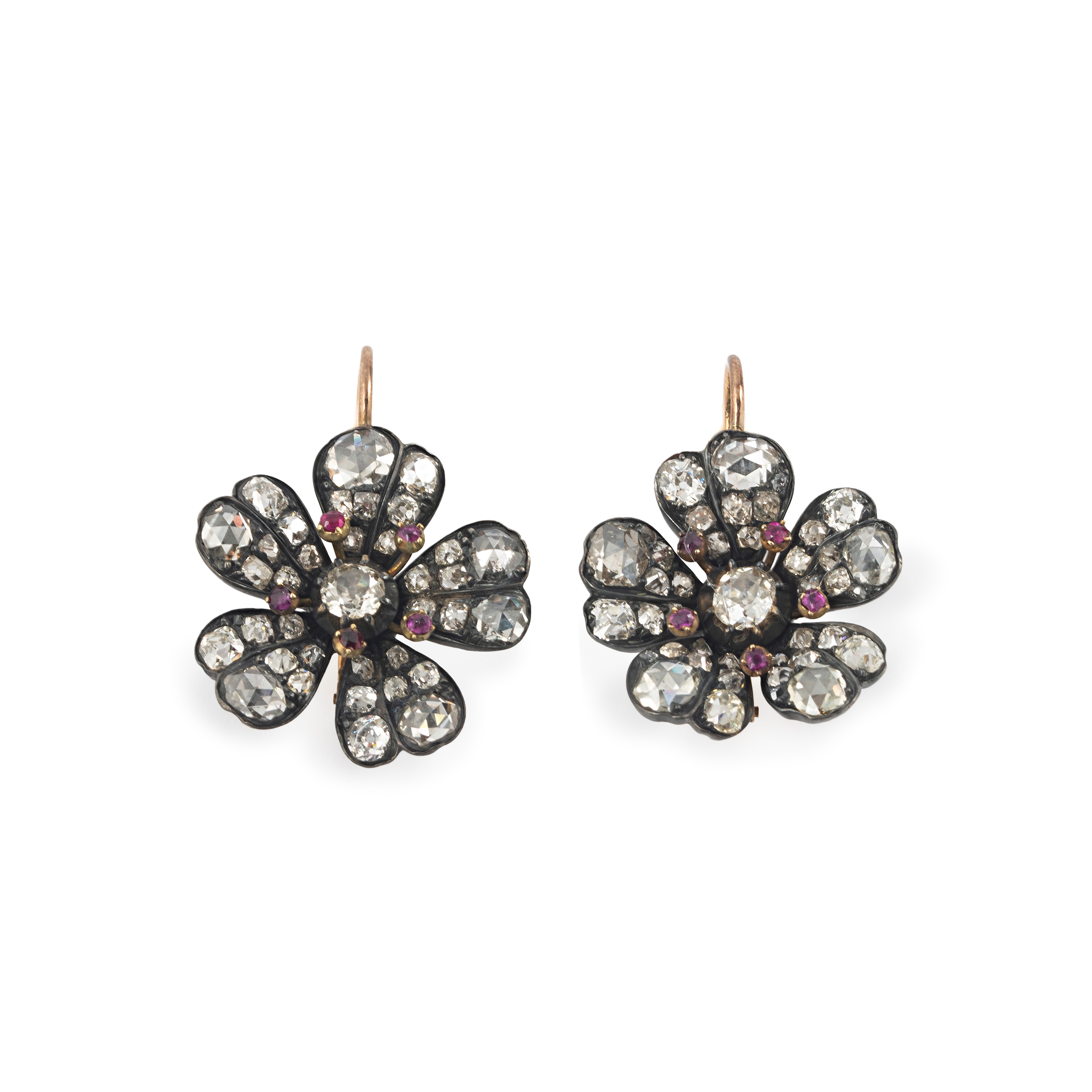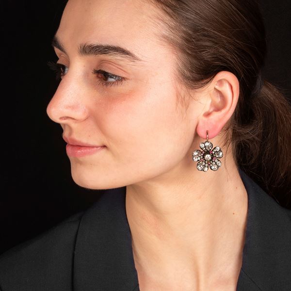Pair of large pendant earrings made like a flower in 9 kt gold, silver, diamonds and rubies