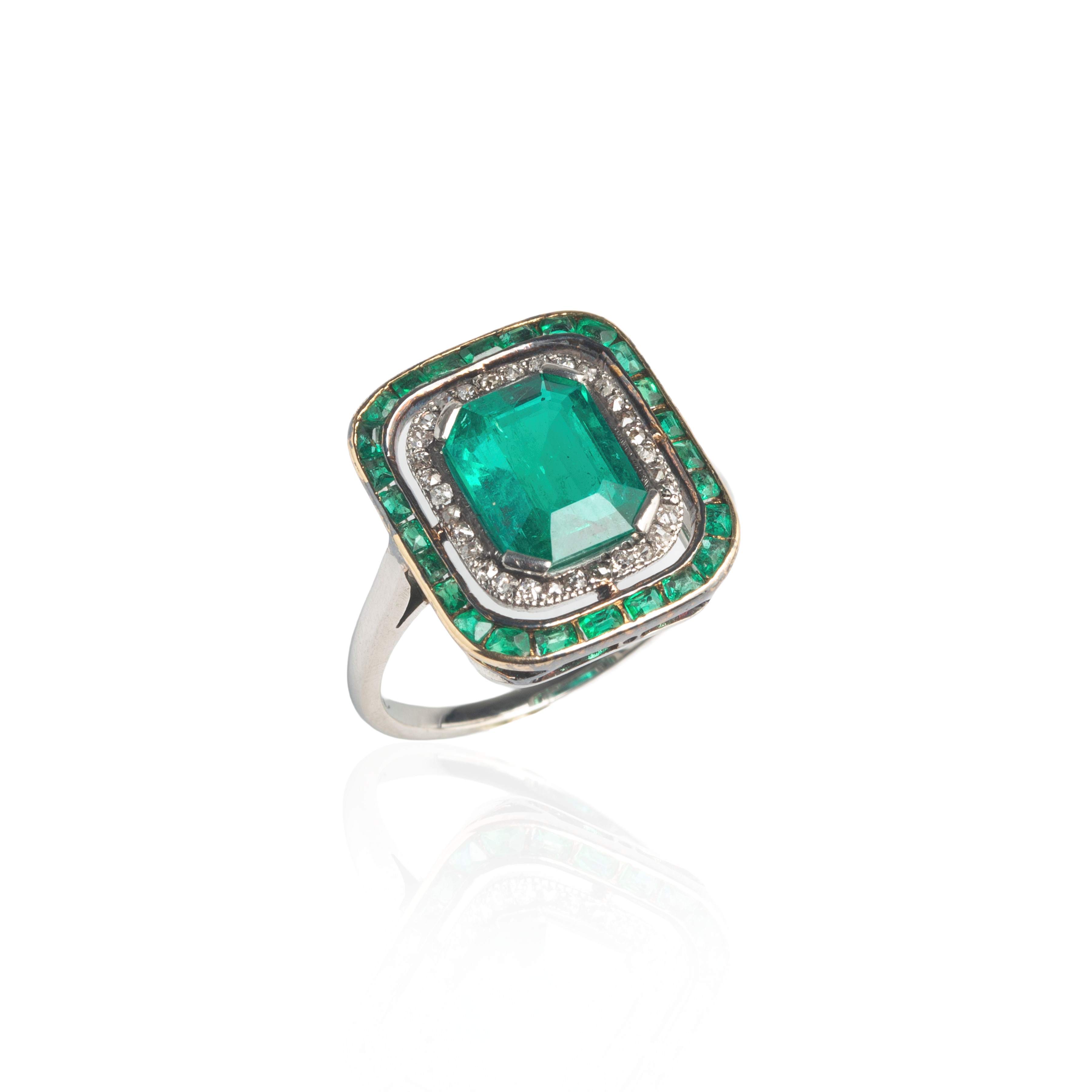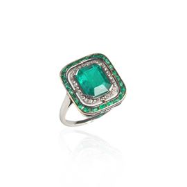 Size 13Rectangular cut emerald of approximately 2.10 ct, old cut diamonds of 0.30 ct and baguette and trapezoid cut emeralds of 1.50 ct, signed Cartier but the signature is difficult to read, 4 g
