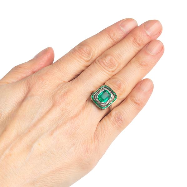 Ring in 18 kt white gold, diamonds and Colombian emerald