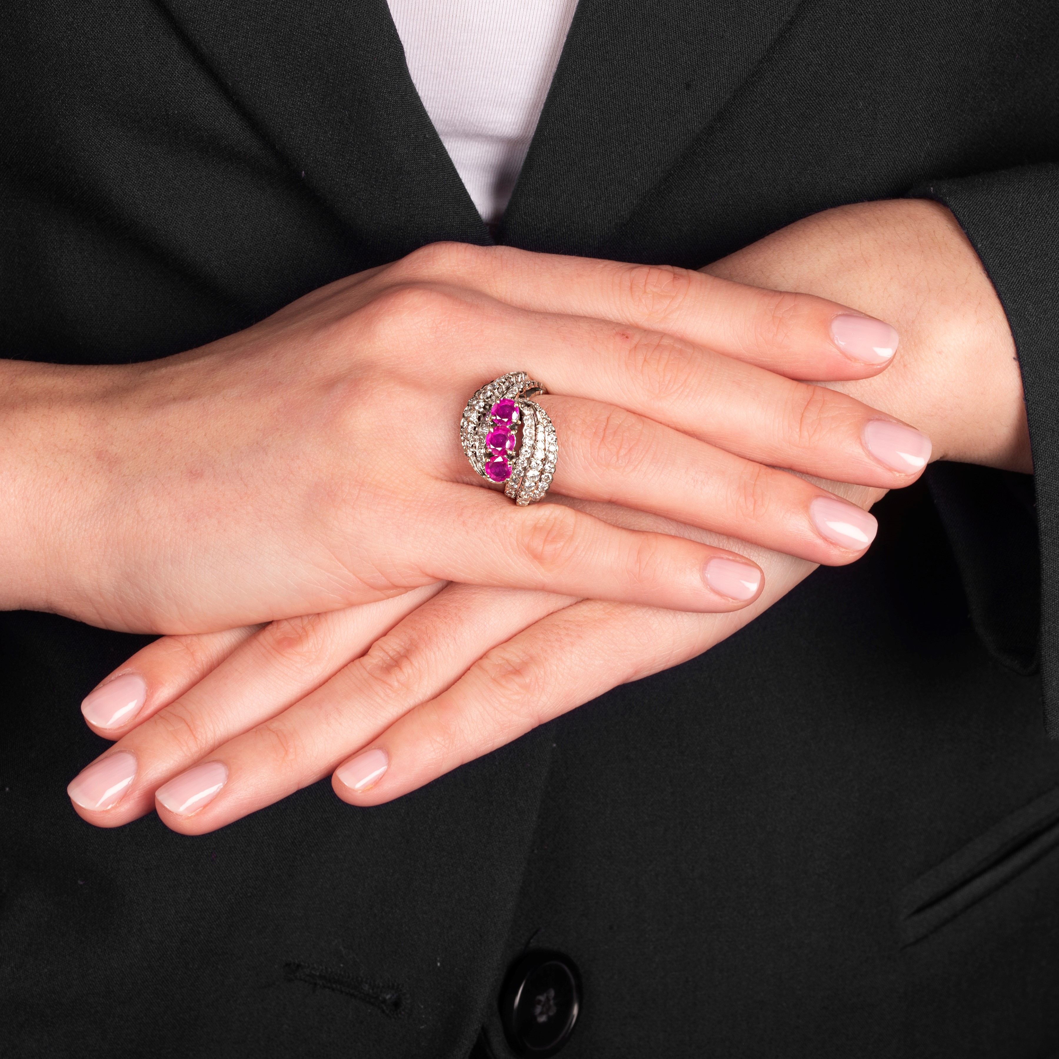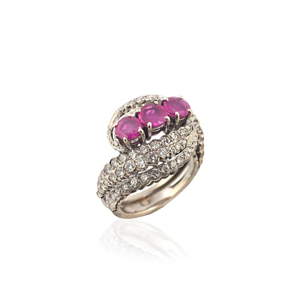 Size 13Brilliant cut and huit huit diamonds for approximately 0.80 ct and three round cut rubies for approximately 1.60 ct, 10.6 g