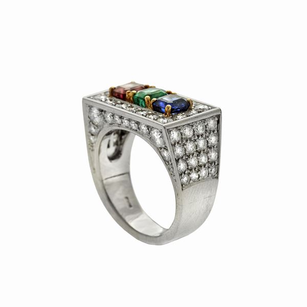 Anello a ponte in oro platino, diamanti, rubino, smeraldo e zaffiro