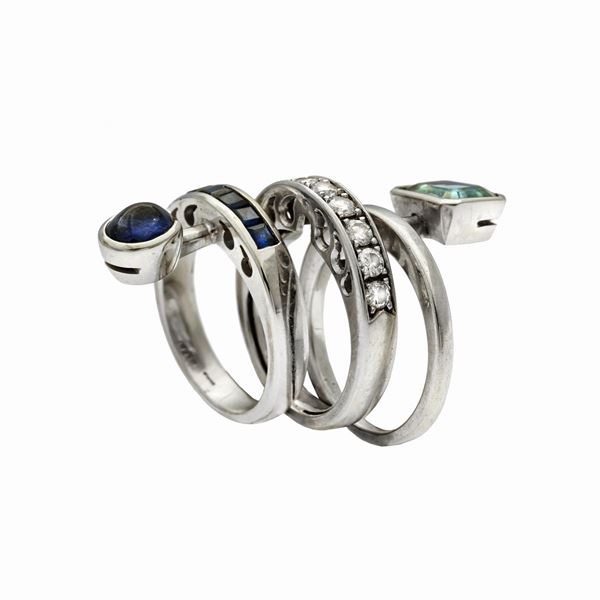 MATERIALE: oro bianco, diamanti, acquamarina e zaffiri DESCRIZIONE: anello composè realizzato con tre anelli diversi, il primo in oro bianco e diamanti taglio brillante, il secondo con acquamarina taglio smeraldo e l'ultimo con zaffiri taglio carrè con zaffiro taglio cabochon ovale, recano il marchio 750 MISURE: misura 14 PESO: diamanti ct 0.50, gr 19.8