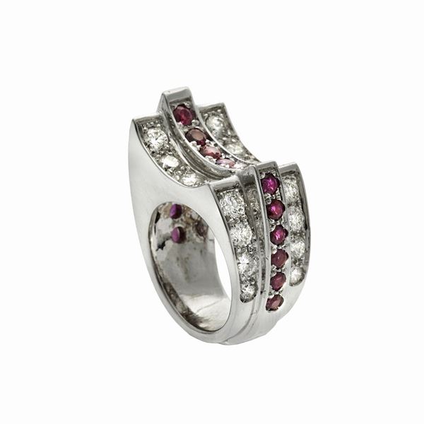 MATERIALE: oro bianco, diamanti e rubini DESCRIZIONE: Anello a fascia con design a onda, impreziosito da diamanti taglio brillante e rubini MISURE: 10 PESO gr 22,2