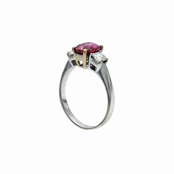 MATERIALE: oro bianco, rubino e diamanti DESCRIZIONE: anello realizzato con al centro rubino taglio ovale tra due diamanti taglio princess MISURE: 13 PESO: rubino ct 1.90, diamanti ct 0.40, colore G-H, purezza VVS, gr 3.8