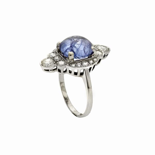 MATERIALE: oro bianco, diamanti e tanzanite DESCRIZIONE: anello con grande tanzanite centrale taglio cabochon su base sagomata, impreziosita da diamanti taglio brillante MISURE: 17 PESO: gr 6.2, diamanti ct 1,30